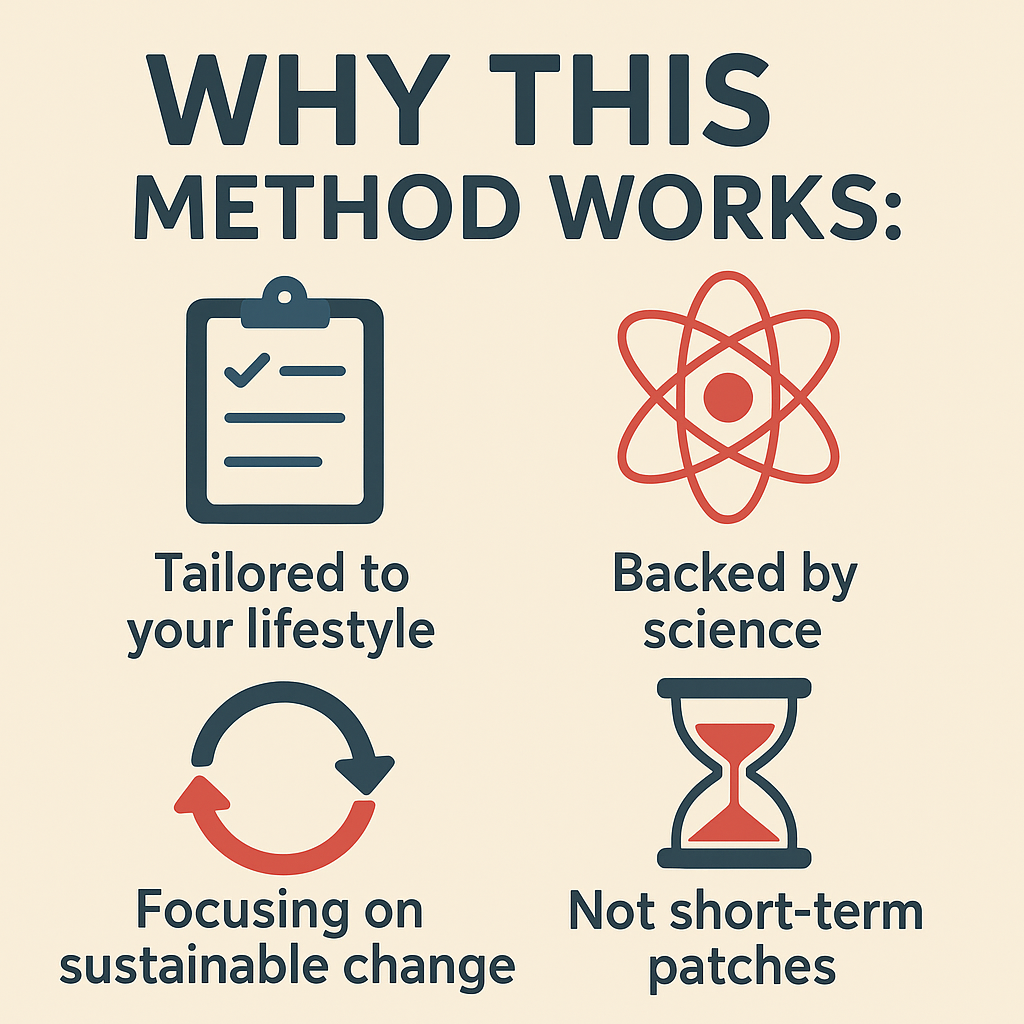 Why This Method Works: Unlike generic programs, our system is tailored to your lifestyle and backed by science — focusing on sustainable change, not short-term patches.